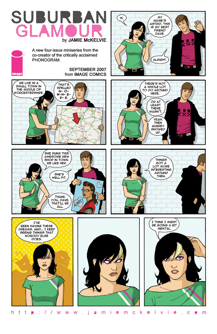 Friend of NTS Jamie McKelvie has a new comic coming out in September. It's called Suburban Glamour, and it's clearly going to be rather good. He's already gone on about it a fair bit here, but now, through the medium of brilliant-one-page-advert-strips, let Astrid and Dave give you a bit more info...