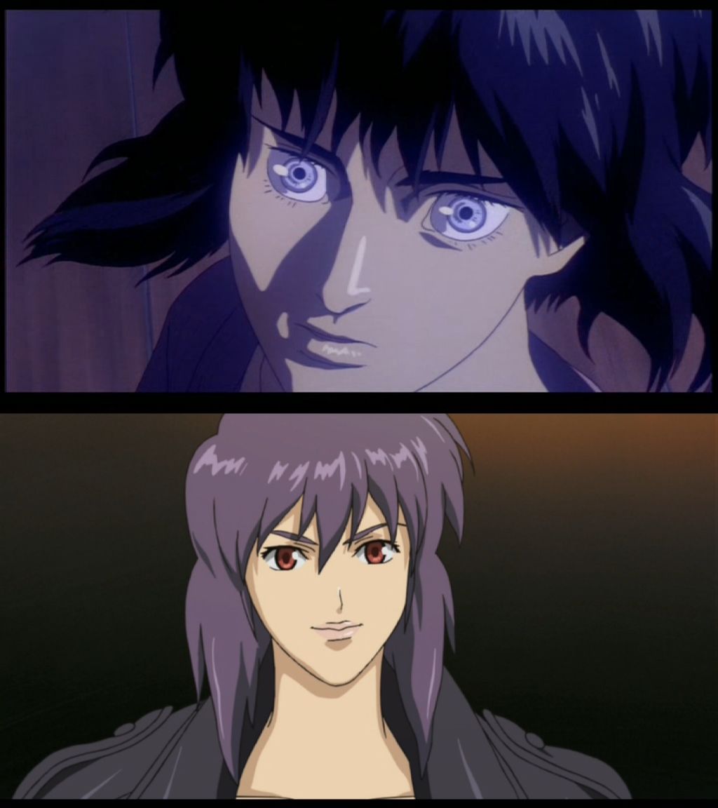 One thing you may notice when viewing the different titles is that the main character - Major Motoko Kusanagi - is depicted differently in each incarnation. In the colour pages of the manga, she has red eyes, and either brown or iridescent blue hair. In the first film though, she has near-black hair and cold, light-blue eyes. In the series, she has violet hair and red/brown eyes.